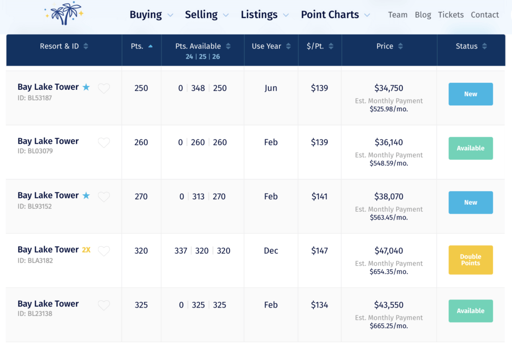As of April 2025, the average price per point for a Bay Lake Tower contract is $133 per point. For a 160-point resale contract, the total cost would be $21,280. That’s $22,720 less than the cost of a 160-point direct contract!