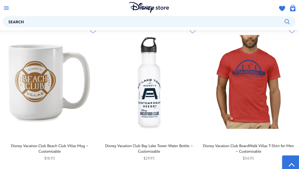 Your home resort may be your home away from home, but when you are at your actual home, you can find DVC merchandise online at disneystore.com. The selection isn’t as great as the resort stores, but a unique offering is the line of customizable shirts, totes, mugs, and tumblers featuring the various home resorts. You can add your last name and the year that you became a DVC Member.