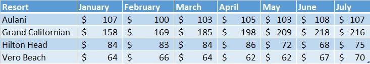 Below is a chart and graph detailing the average prices per point for each Non-WDW DVC Resort, January – July of 2018: