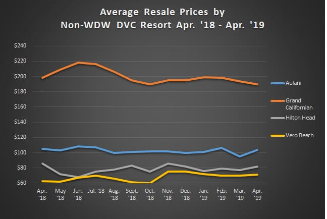 Below is a chart and graph detailing the average prices per point for each Non-WDW DVC Resort, April 2018 – April 2019: