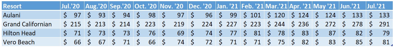 In the past couple of months, we have begin to see a more balanced market emerge. Supply is keeping pace with demand if not exceeding it for some resorts. The results are showing a month-to-month leveling off in resale prices for the first time in 2021. From June to July, seven resorts experienced price drops, seven resorts saw price increases and one resort stayed the same. Overall, the average price per point across all resorts stayed roughly the same too, at approximately $153.