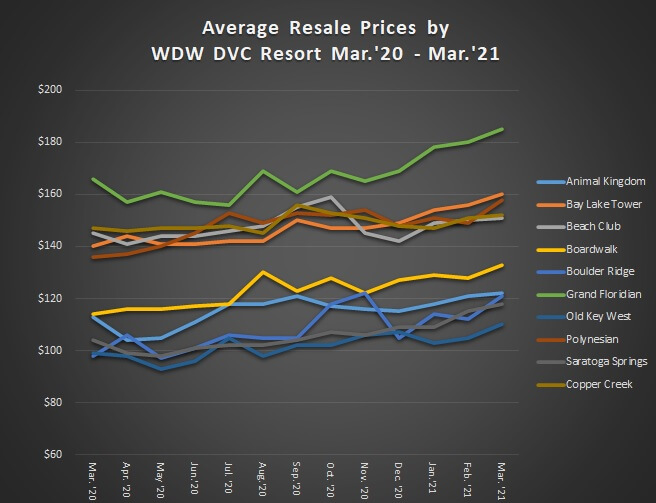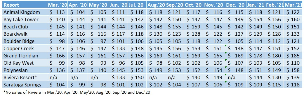 This article features the average sales price of contracts categorized by resort and month sold from March 2020 through March 2021 by DVC Resale Market (DVCRM). Our goal for this article is to provide great directional information for anyone considering a Disney Vacation Club (DVC) resale purchase or just wanting to satisfy a general curiosity of prices and trends.