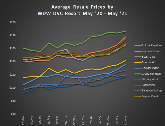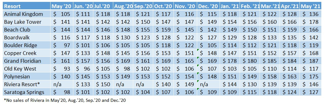 This article features the average sales price of contracts categorized by resort and month sold from May 2020 through May 2021 by DVC Resale Market (DVCRM). Our goal for this article is to provide great directional information for anyone considering a Disney Vacation Club (DVC) resale purchase or just wanting to satisfy a general curiosity of prices and trends.