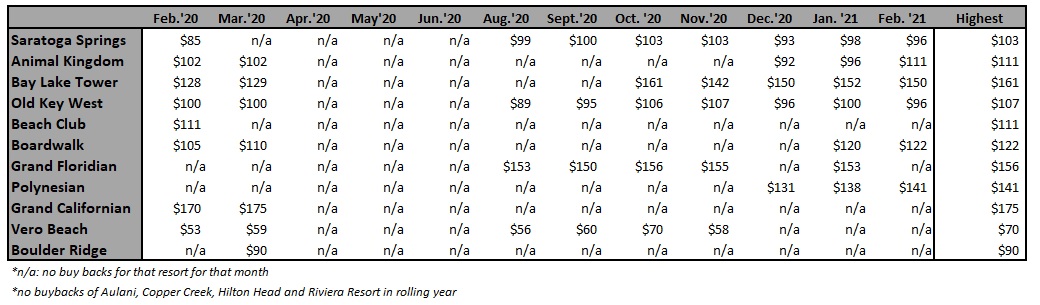 Highest Buy Back Price Per Point by Resort from February ’20 to February ’21