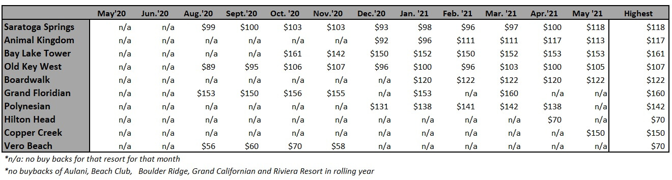 The table below shows the percentage of buy backs for all 9 different resorts that have had at least one contract bought back in 2021. Note, there were no buy backs of the following resorts in 2021: Aulani, Beach Club, Boulder Ridge, Grand Californian, Riviera Resort and Vero Beach.