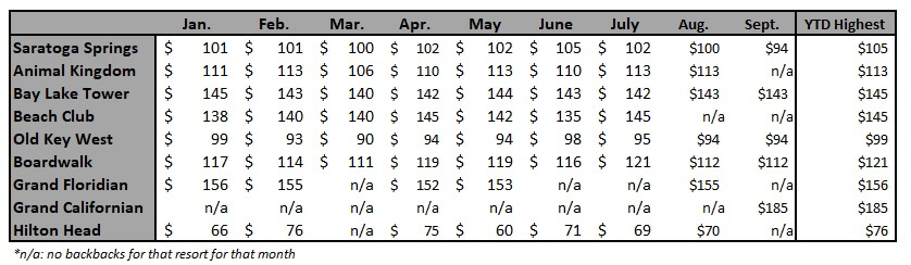September brought some of the most significant changes in buy back strategy thus far in 2019.  For the first time all year we observed buy backs with Grand Californian (GCV) and only 1 buy back between Animal Kingdom (AKV) and Saratoga Springs (SSR) combined.  YTD, AKV and SSR represent over half of all buy backs, but in September accounted for only 1 of 19.