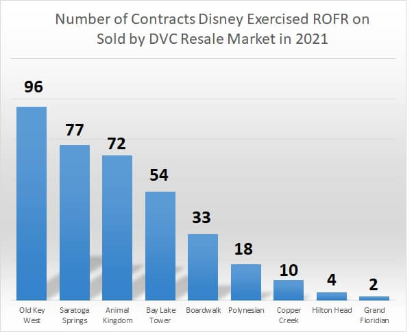 Year-to-date (YTD) through September 2021, Disney has exercised their right of first refusal (ROFR) on 304 Disney Vacation Club (DVC) contracts. DVC Resale Market (DVCRM) has sold 3,493, resulting in a 10.5% buy back rate (Contracts Bought Back in 2021/Contracts Sold in 2021). The 2021 waiver rate is 89.5%.
