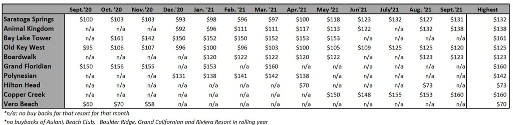 - 95% of all buybacks in September were from three DVC resorts: Animal Kingdom (30), Saratoga Springs (27), Old Key West (19).