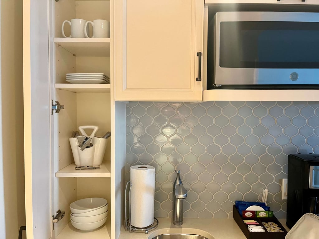Deluxe Studios are more than just glorified hotel rooms! One of the biggest differences is the addition of a kitchenette that includes a mini fridge, microwave, toaster, and coffee maker. They also have plates, bowls, cups, and utensils. It’s just enough to make a quick breakfast, heat up leftovers, or make a simple snack or meal.