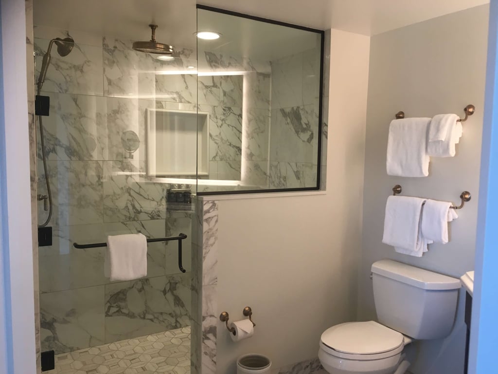 The bathroom is beautiful and extremely spacious given the size of the Tower Studio. In fact, it probably makes up half of the room’s square footage. The large shower has a rainfall shower head, and there is lots of counter space by the sink.