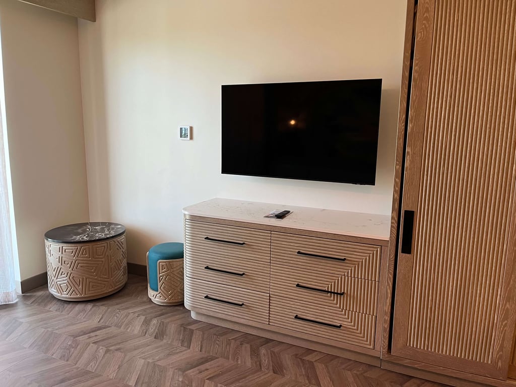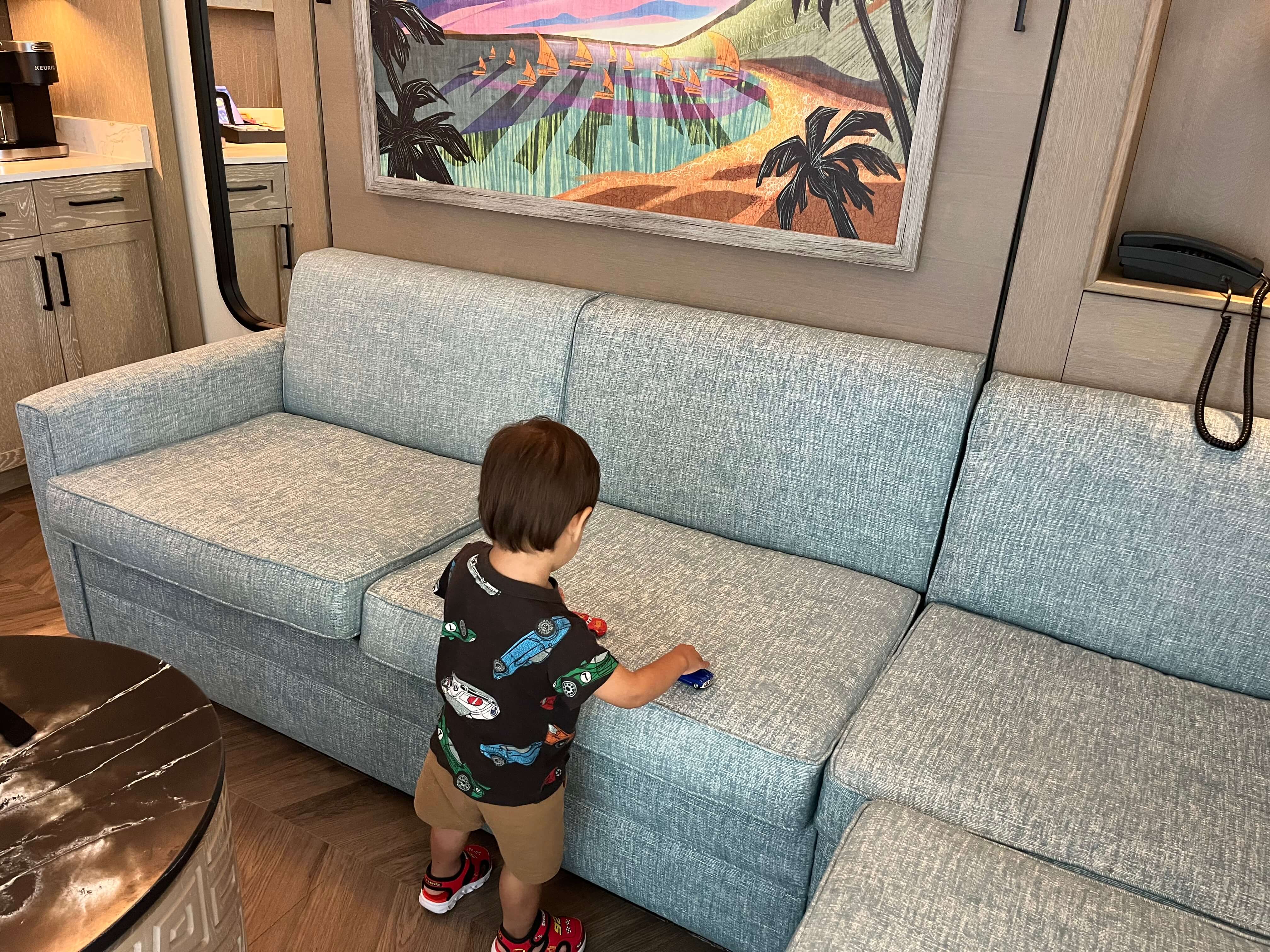 Toddlers may be small, but they often have a lot of gear when it comes to traveling. Luckily, the Duo Studio has a decent amount of storage.  You’ll find a large dresser with 6 drawers under the TV. There is also lots of cabinet space in the kitchenette and counter space all throughout the studio. While there is no washer or dryer in the Duo Studio, you can always use the laundry facilities on the ground level of the Island Tower if you prefer to pack lighter.