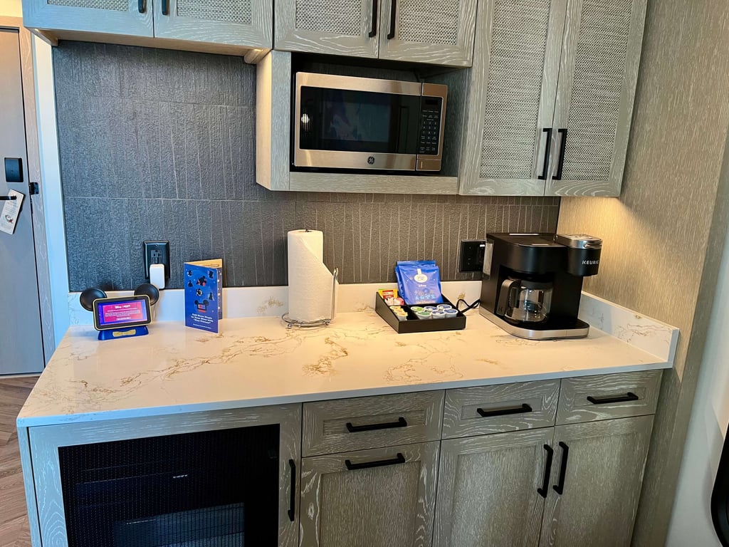 The kitchenette is slightly different from those in the typical Deluxe Studio. While it has a coffee maker, microwave, toaster, and dishes and utensils, it does not have the extra sink or a mini fridge. Instead, it has a beverage cooler that doesn’t get as cold as a true fridge. This may mean packing snacks and drinks that don’t require refrigeration like shelf-stable milk.