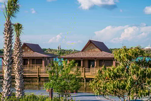 You’ll know these suites are special as you walk across the wooden bridge to your destination. Disney has built these Bungalows into the water. So, they’re the closest rooms at the hotel to Magic Kingdom, and your view includes landmarks like Space Mountain and Cinderella Castle.