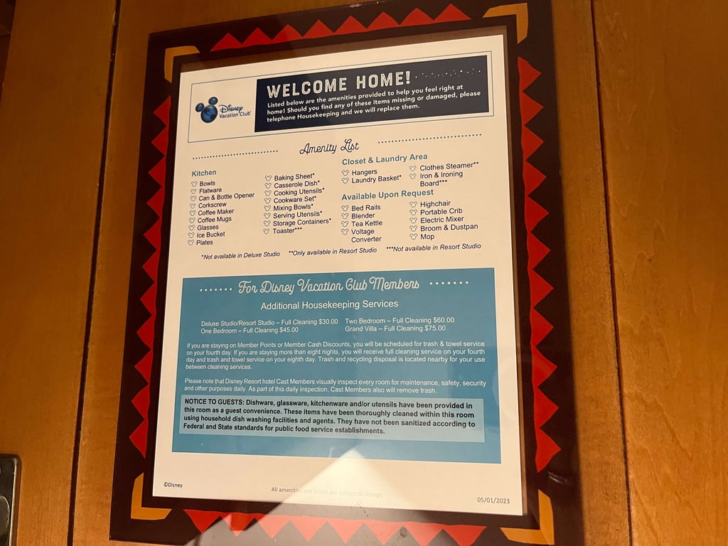 If you’re accustomed to cash stays, you may be used to having a refreshed room every other day. However, with stays booked on DVC points, the cleaning schedule is less frequent. For stays of 7 nights or less, you get trash and towel service on the fourth day of the stay. For stays of 8 nights or more, you get a full cleaning service on day 4 and trash and towel service on day 8. The cycle then restarts on day 12.