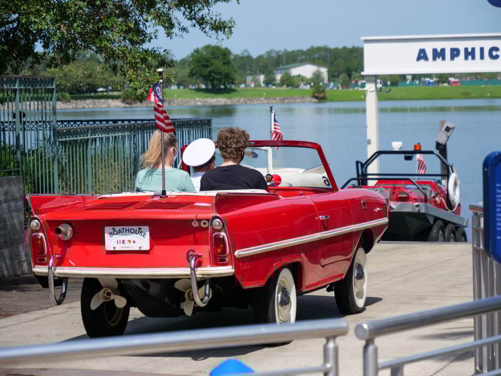 So, the management team came up with a terrific idea. You can ride in an Amphicar! For a modest fee of $125 per car, your captain will take up to three guests on a guided tour of Lake Buena Vista.