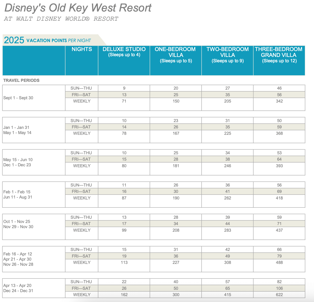 These older resorts are incredibly economical when it comes to points. A look at the 2025 Old Key West points chart shows that Deluxe Studios start at just 9 points per night and Three Bedroom Grand Villas max out at 106 points per night. To put those values in perspective, a Riviera Deluxe Studio starts at 14 points per night and a Riviera Three Bedroom Grand Villa can be up to 204 points per night!