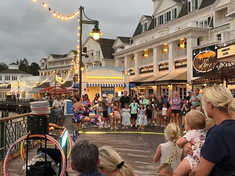 Entertainment troupes, collectively known as the Boardwalk Buskers, perform anything from gymnastics to juggling to magic tricks. You’ll also find a few strolling musicians, just like at Disney Springs on the weekends. However, you can usually get a much closer view of the performances on the Boardwalk, making it the preferable option.