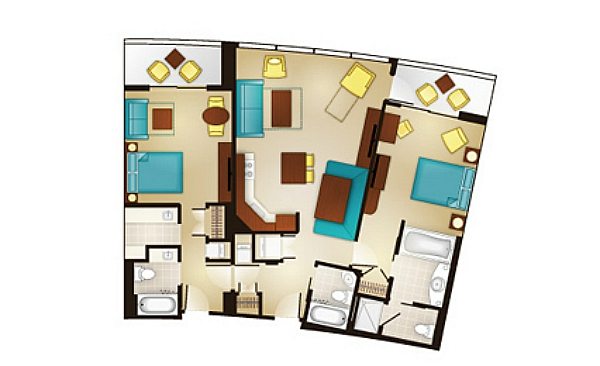 Two-Bedroom Lock-Off Vacation Homes feature three full bathrooms. Each features the amenities of a One-Bedroom Vacation Home, plus an additional bedroom with flat-panel TV, DVD player, queen-size bed, double-size sleeper sofa, and private bathroom.
